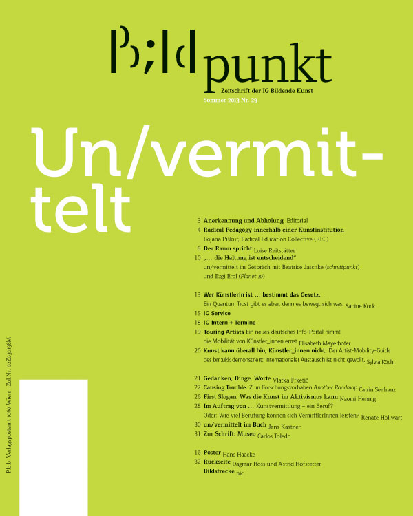 Der Vorstand ein Team aktiver Künstlerinnen vertritt die IG Bildende Kunst nach außen. Zentral sind dabei ästhetische aktivistische und theoretische Strategien samt ihrer gegenseitigen Verschränkungen und Überschneidungen. Und andere nützliche Infos in der Covid-19-Krise.